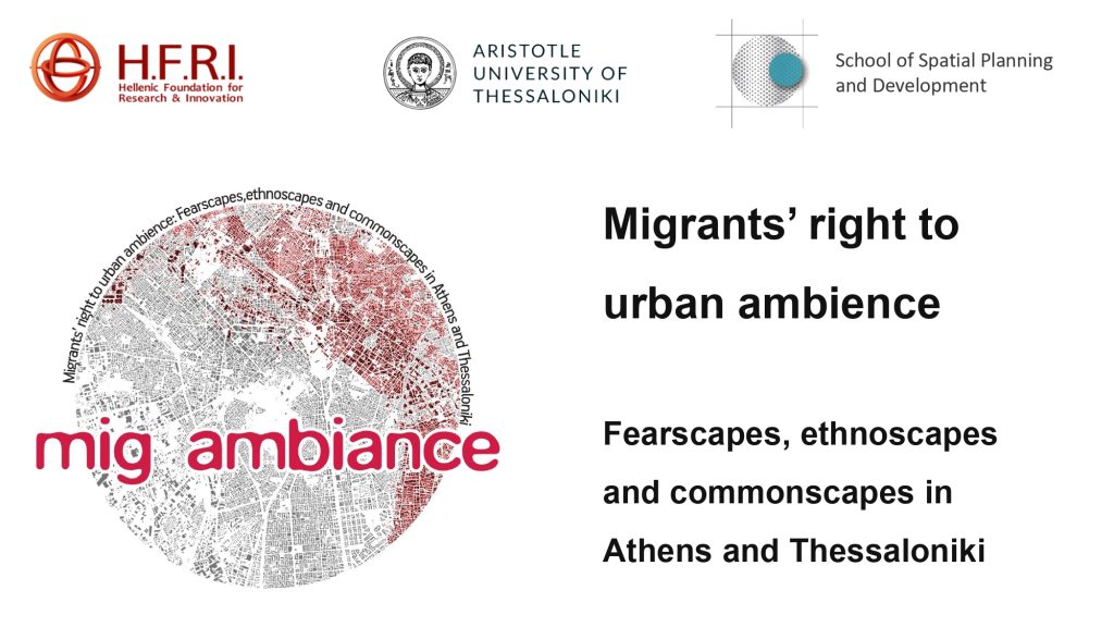 MIGAMBIANCE intends to explore aspects of migrants’ embodied practices, relations and encounters in urban areas through the looking-glass of urban ambiance, which both determines migrants’ presence on the urban space and is transformed because of it. Its empirical perspective is organized along different “landscapes” of urban ambiance in relation to migrants’ presence: “fearscapes”, referring to spaces marked by xenophobic reactions, racially motivated violence and police harassment; “ethnocscapes”, relating to the infrastructures created by the migrants themselves such as shops and associations; and “commonscapes”, accounting for solidarity initiatives producing common spaces for locals and migrants. The project is innovative in combining critical geographic literature from urban and migration studies with recent works on urban ambiances, enrich thus the scholarly debates on migrants’ contribution to the production of space and the right to the city. The project will explore the above through an innovative combination of quantitative and especially qualitative methodologies, which give voice to migrant subjects and incorporate their perspectives in the research process itself, allowing for the production of critical cartographies of migrants’ (right to) urban ambiance(s) in Athens and Thessaloniki.